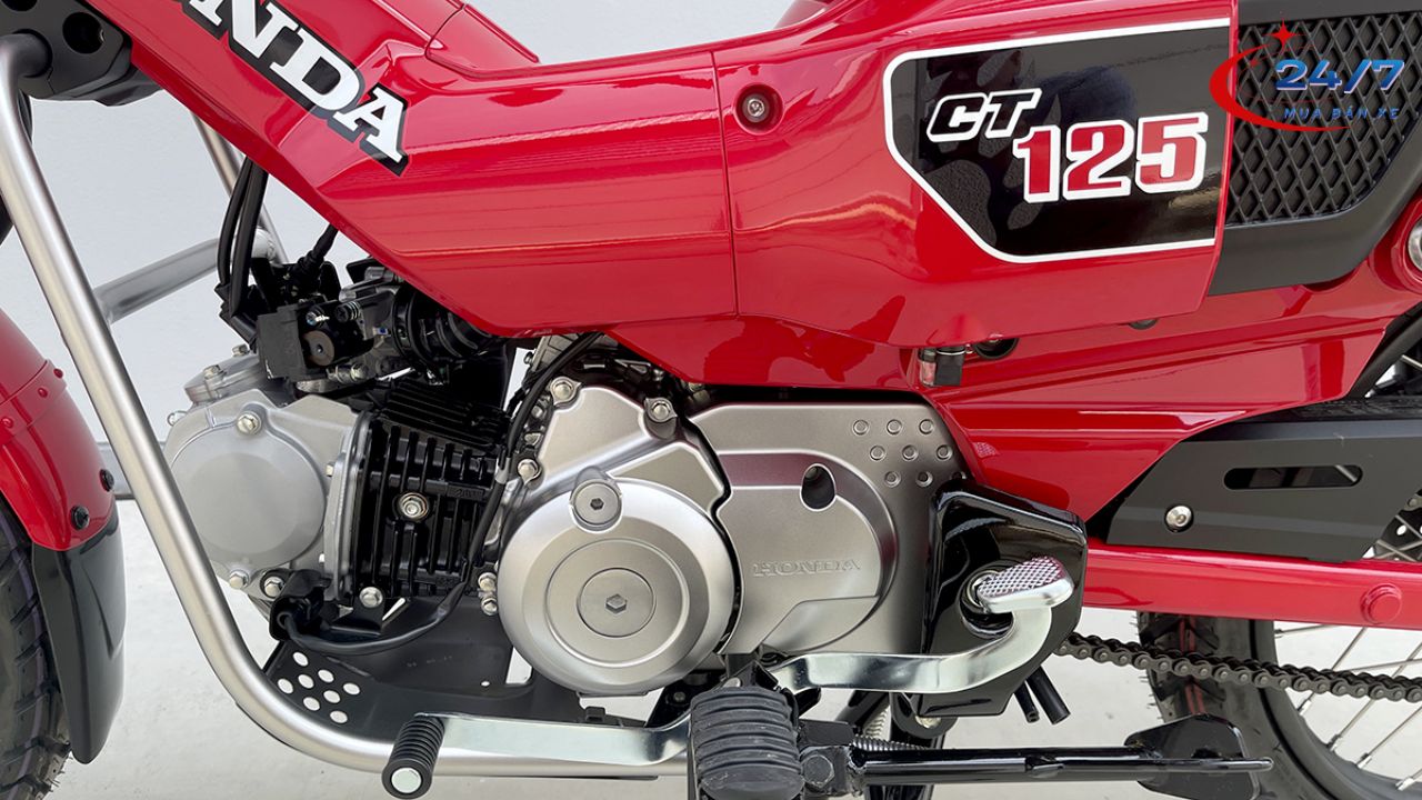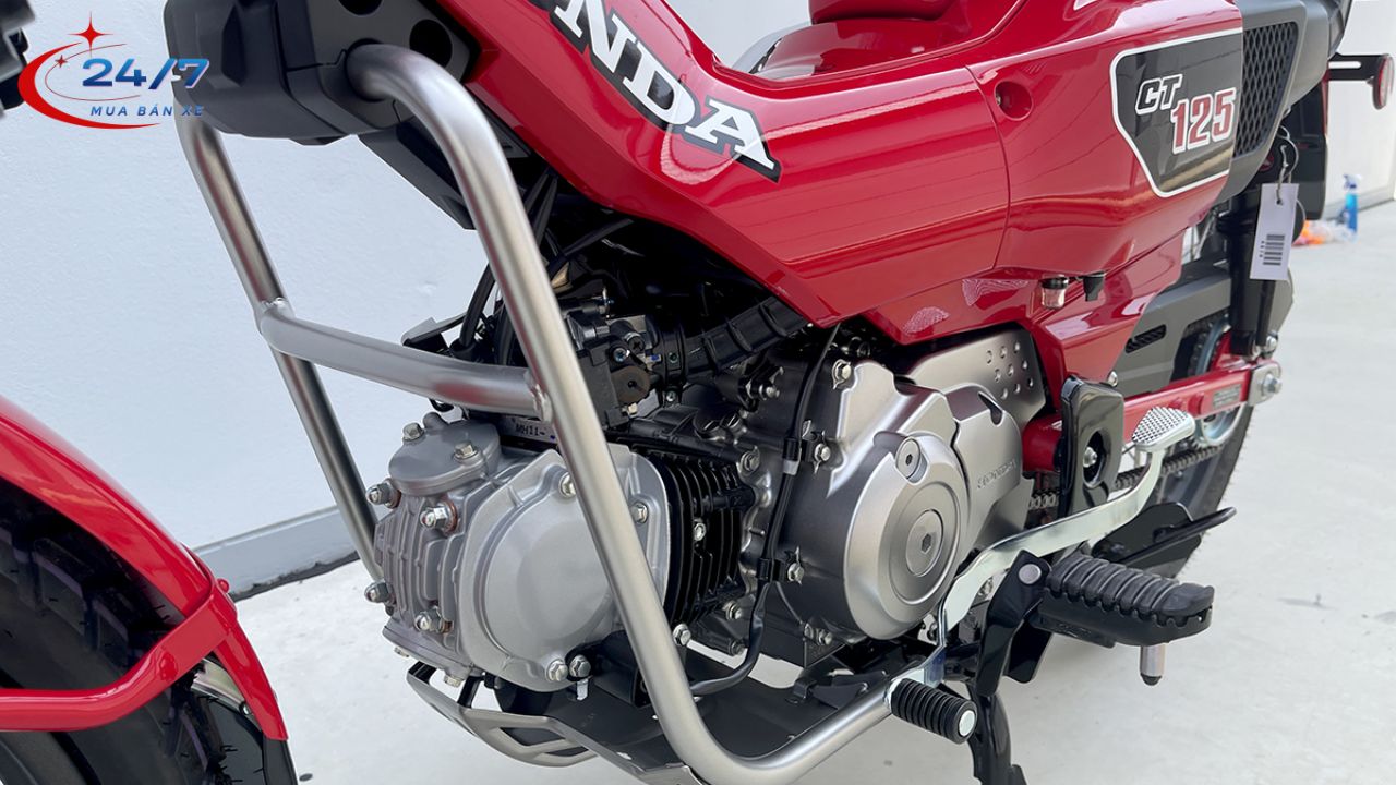 Honda CT125 ABS Màu Đỏ sử dụng động cơ 124cc, xi lanh đơn, làm mát bằng gió. Khối động cơ này tập trung vào độ bền và khả năng tiết kiệm nhiên liệu. Công suất khoảng 8,8 mã lực đủ để di chuyển linh hoạt trong nhiều điều kiện, từ đường phố đến đường địa hình nhẹ.